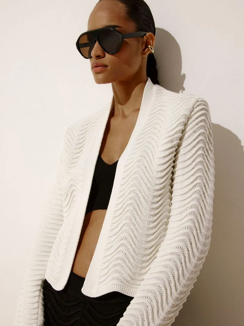 O movimento suave das ondas inspira a trama do casaqueto curto. Com modelagem ajustada, manga longa e textura tridimensional, é a terceira peça perfeita para arrematar os looks de verão com frescor e elegância.