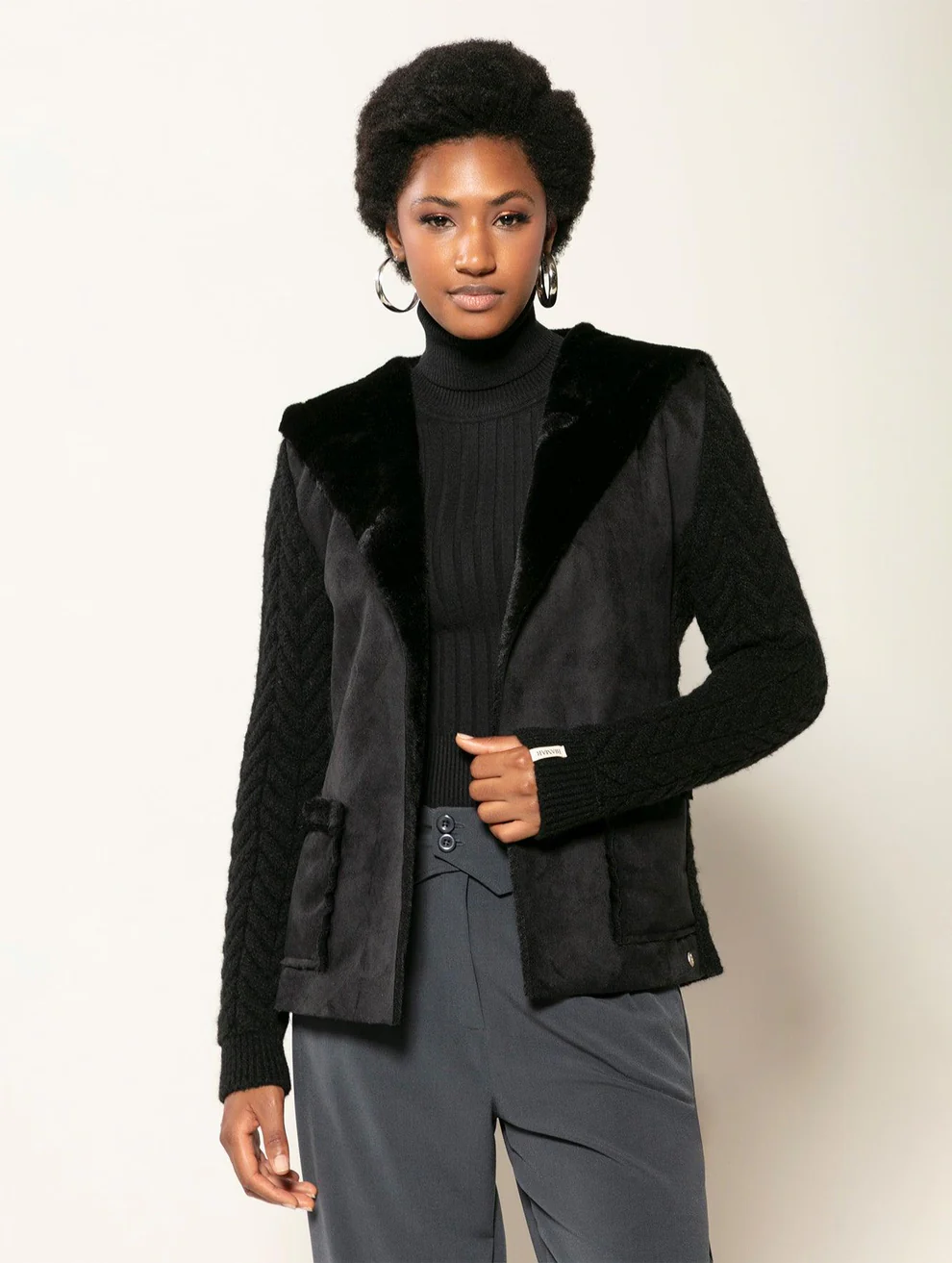 Seu inverno fica mais quente e acolhedor com o casaco com tecimento em tranças e pele fake com capuz e sem fechamento frontal Biamar 11860. A união de fios, tecidos e tramas resultou em um modelo moderno e aconchegante. Além disso, os recortes de materiais proporcionam o efeito de duas peças em uma, como se a pelugem formasse um colete. Descubra o conforto e a elegância da Biamar em cada detalhe desta peça incrível. Não perca a oportunidade de ter uma peça-chave no seu armário.
